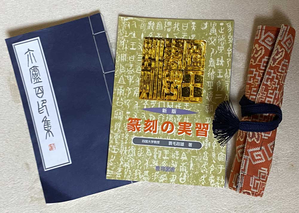 突然の訪問にもかかわらず快くご指導、補刀してくださり 私の極太の印刀に驚かれて細い印刀を3本、他にも印刀を入れる手作りの巻物や篆刻のテキストや印集など惜しげもなく次々と持たせてくださいました